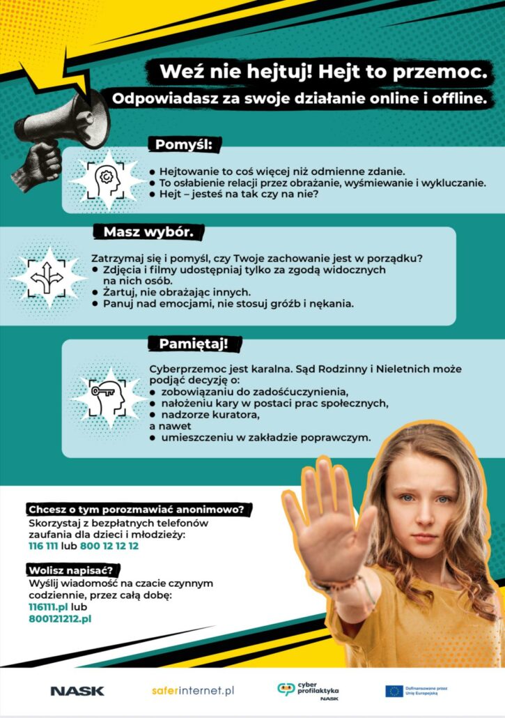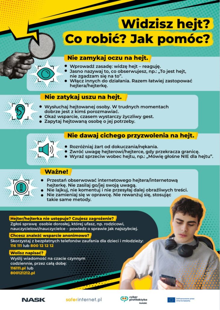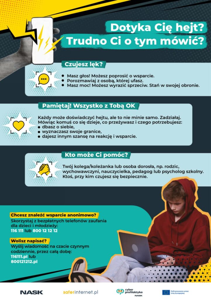 Miniony tydzień upłynął nam pod znakiem refleksji, rozmów i działań na rzecz bezpiecznych relacji i wzajemnego szacunku. W ramach kampanii uczniowie uczestniczyli w zajęciach poświęconych tematowi przemocy — uczyli się rozpoznawać jej formy, reagować w sytuacjach trudnych oraz wspierać osoby doświadczające krzywdy. Na szkolnych korytarzach pojawiły się plakaty dotyczące hejtu i przemocy, przypominające, że słowa mają moc – mogą ranić, ale też budować. Wyświetlony został również film poruszający temat agresji, który skłonił uczniów do rozmów o emocjach, empatii i odpowiedzialności. Nie zabrakło też pozytywnego akcentu – karteczki z dobrymi myślami trafiły w ręce uczniów i nauczycieli, a ich przesłanie na stałe wpisało się w atmosferę naszej szkoły.