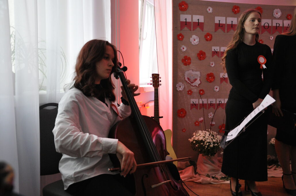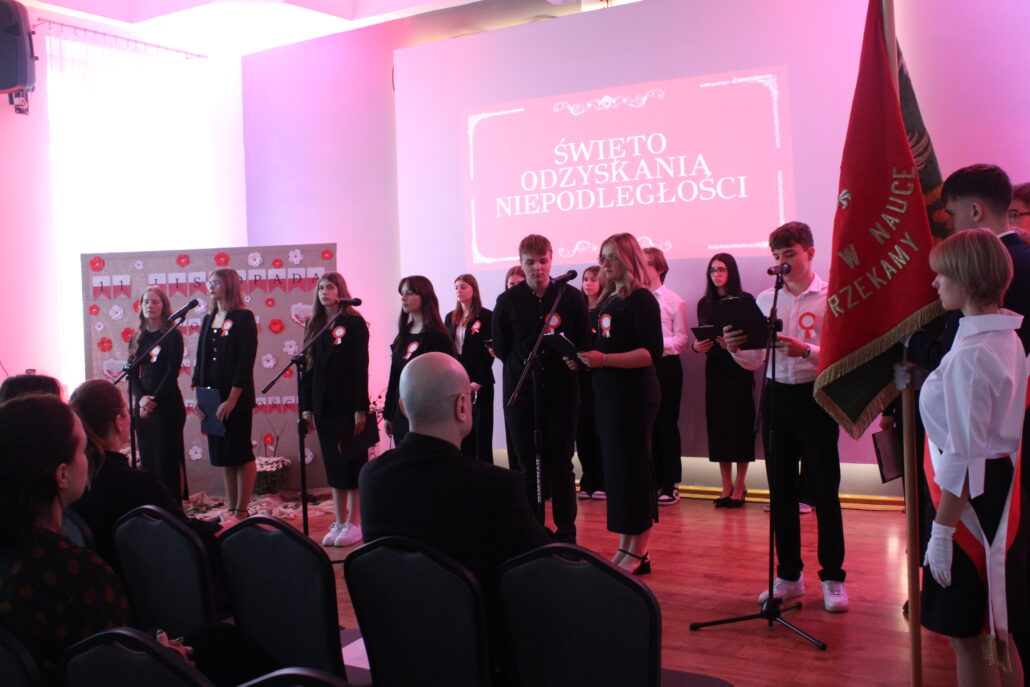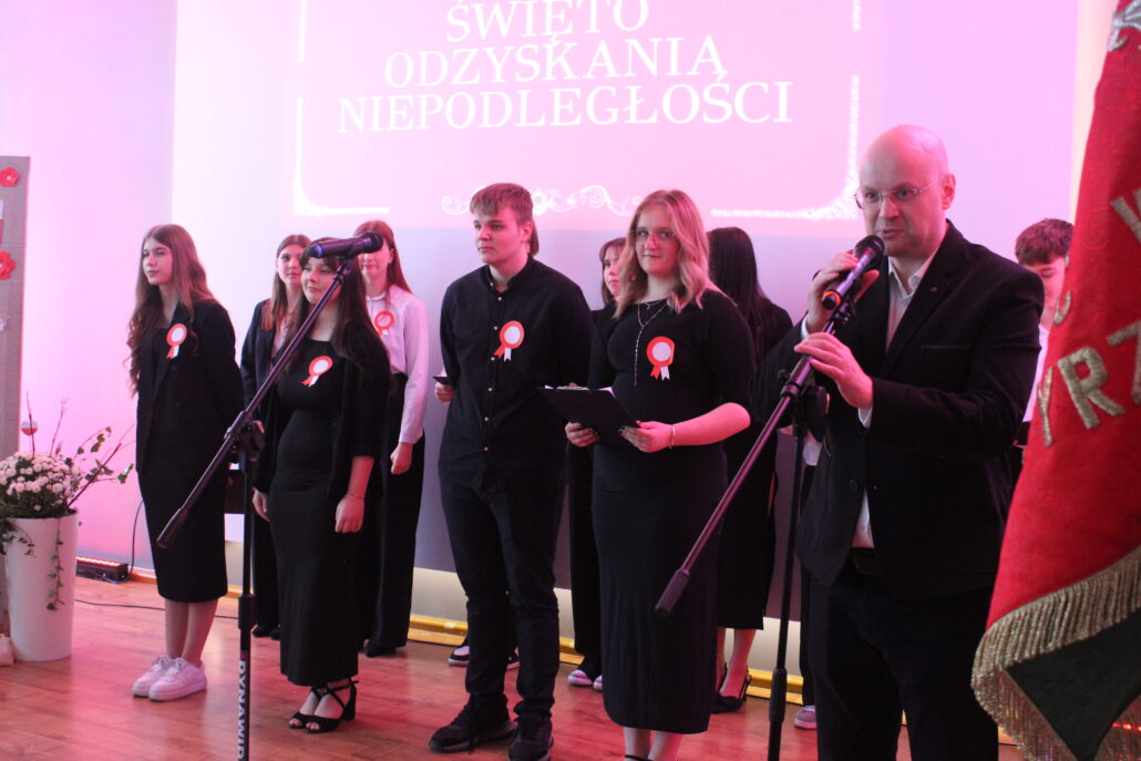 W atmosferze zadumy i patriotycznego uniesienia uczniowie naszej placówki edukacyjnej zaprezentowali program artystyczny oparty na znanych wierszach i pieśniach okolicznościowych okraszonych narracją historyczną. Licznie zgromadzona publiczność miała więc okazję podziwiać umiejętności recytatorskie i wokalne naszej młodzieży. Wiersze „Modlitwa o Polskę”, „Kto cię wołał Legionisto”, „Polsko nie jesteś ty już niewolnicą”, „Warszawa”, „Polska” czy też pieśni takie jak „Mury”, „Przysięga”, „Ostatni list”, „Dziewczyna z granatem w ręce” wzbudzały wśród zebranych poczucie dumy narodowej i przywiązania do polskiej tradycji opartej na ponadczasowych wartościach chrześcijańskich.
