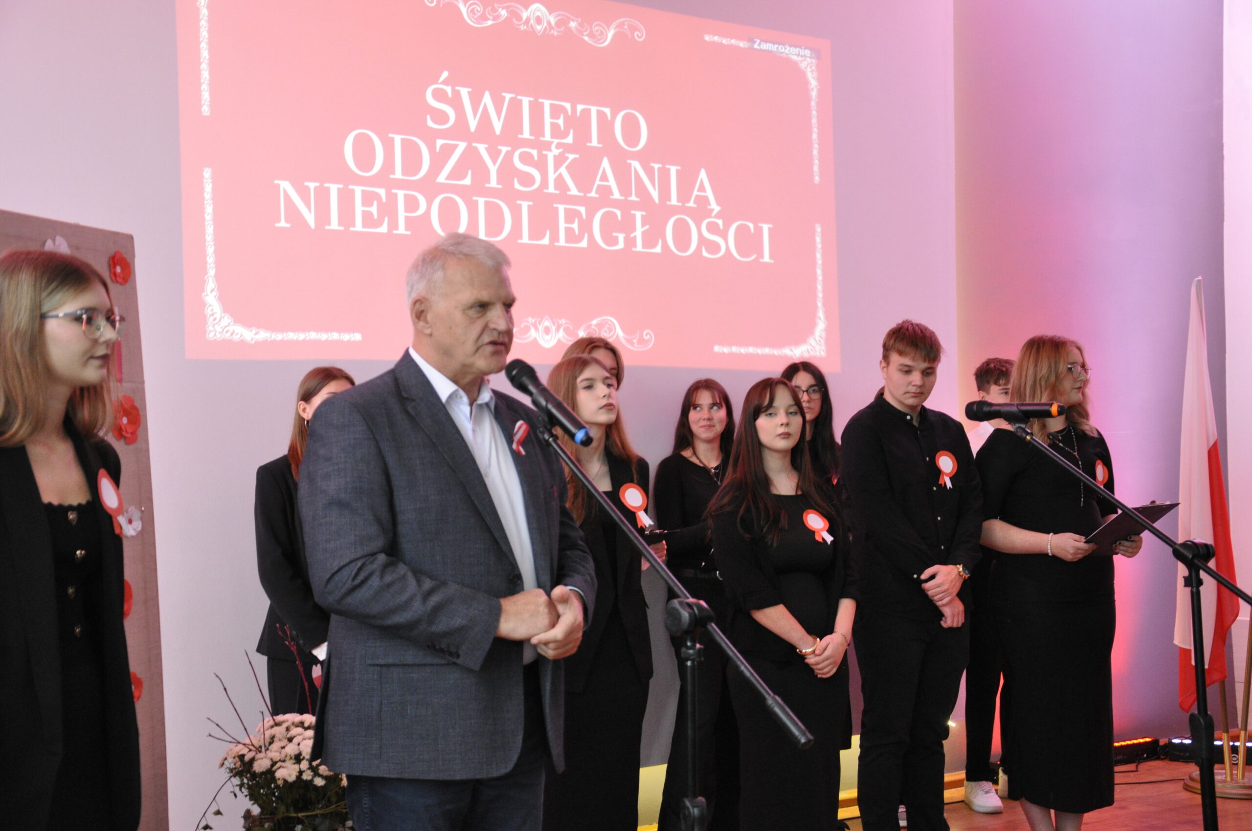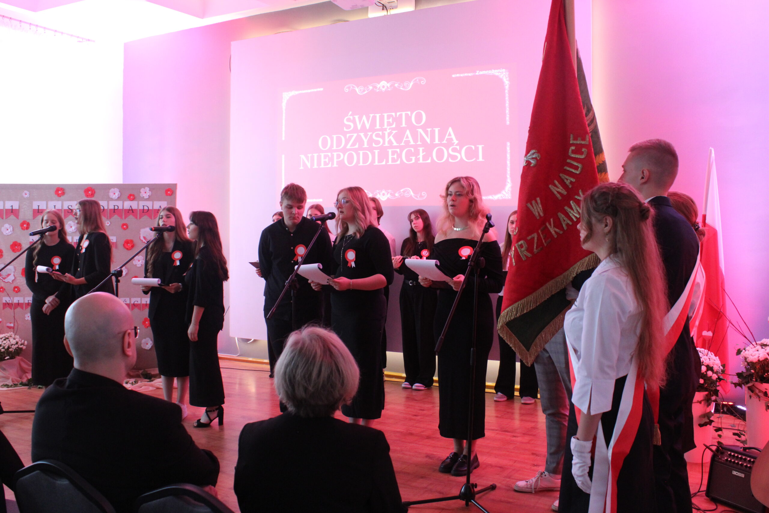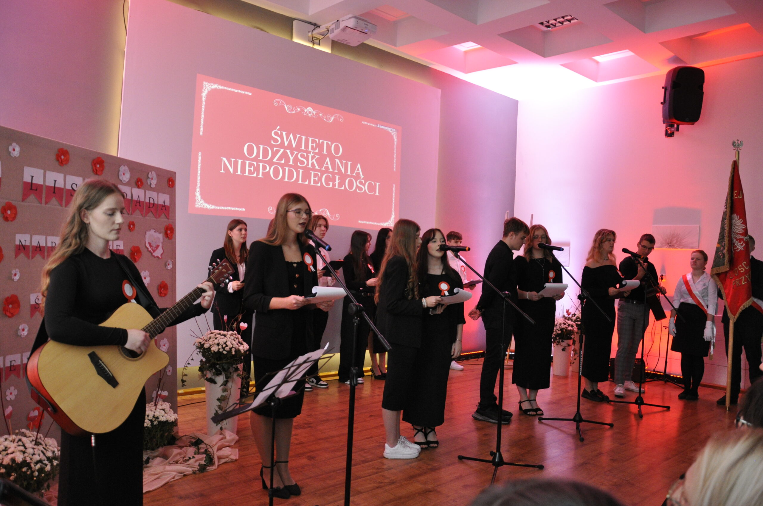 W atmosferze zadumy i patriotycznego uniesienia uczniowie naszej placówki edukacyjnej zaprezentowali program artystyczny oparty na znanych wierszach i pieśniach okolicznościowych okraszonych narracją historyczną. Licznie zgromadzona publiczność miała więc okazję podziwiać umiejętności recytatorskie i wokalne naszej młodzieży. Wiersze „Modlitwa o Polskę”, „Kto cię wołał Legionisto”, „Polsko nie jesteś ty już niewolnicą”, „Warszawa”, „Polska” czy też pieśni takie jak „Mury”, „Przysięga”, „Ostatni list”, „Dziewczyna z granatem w ręce” wzbudzały wśród zebranych poczucie dumy narodowej i przywiązania do polskiej tradycji opartej na ponadczasowych wartościach chrześcijańskich.