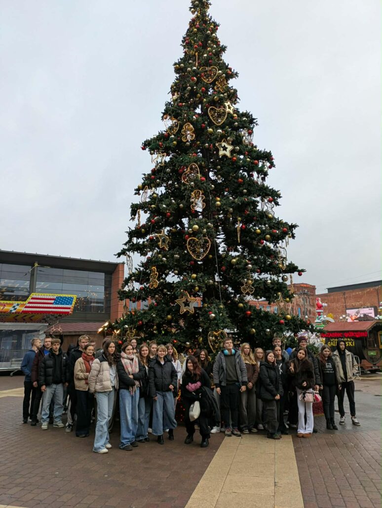 Po części rozrywkowej przyszedł czas na spacer po terenie dawnej fabryki Izraela Poznańskiego. Uczniowie mogli z bliska podziwiać odrestaurowaną ceglaną zabudowę – masywne mury, duże okna i charakterystyczny industrialny klimat. Tym razem Manufaktura prezentowała się wyjątkowo, ponieważ cały kompleks wypełniał świąteczny nastrój. Migoczące iluminacje, choinki i dekoracje sprawiały, że historyczne przestrzenie nabierały jeszcze cieplejszego, bardziej magicznego charakteru. Uczniowie chętnie zatrzymywali się, by zrobić zdjęcia przy świetlnych instalacjach i poczuć atmosferę zbliżających się Świąt.