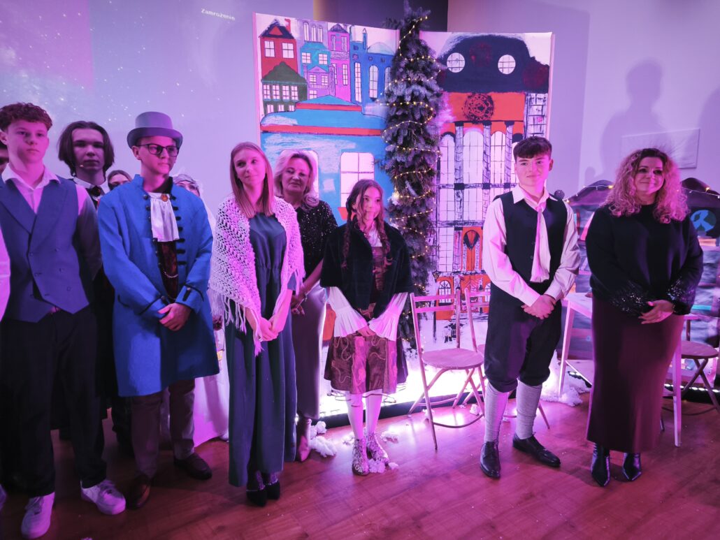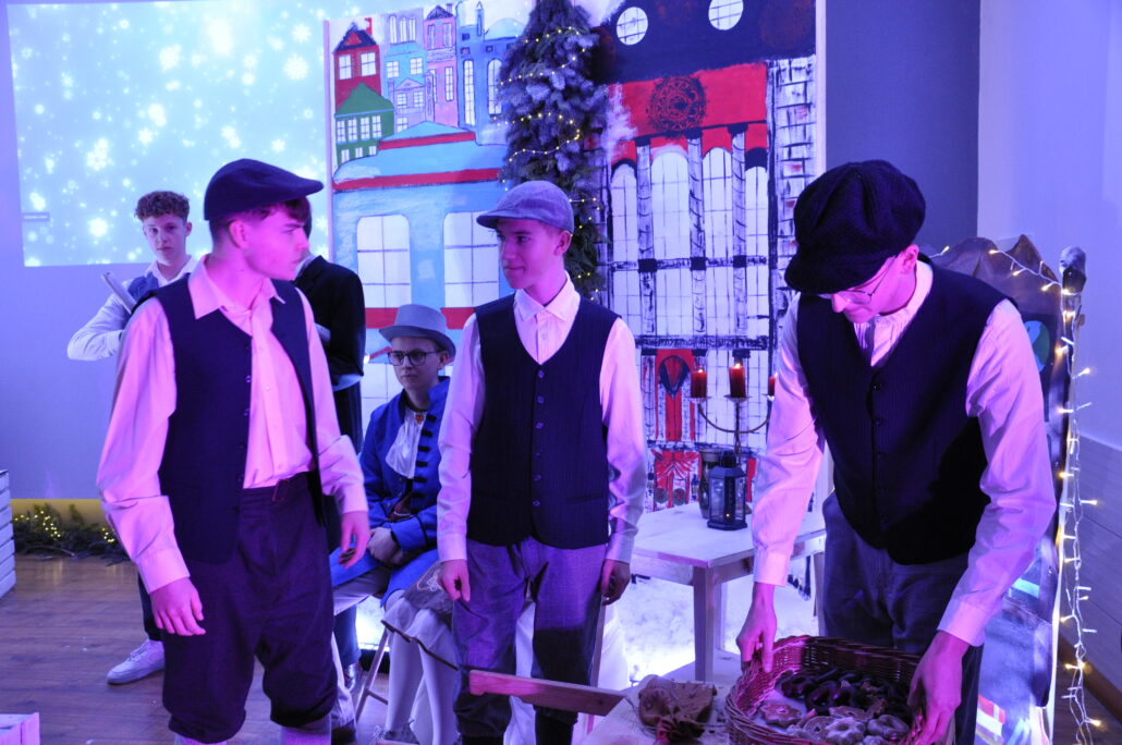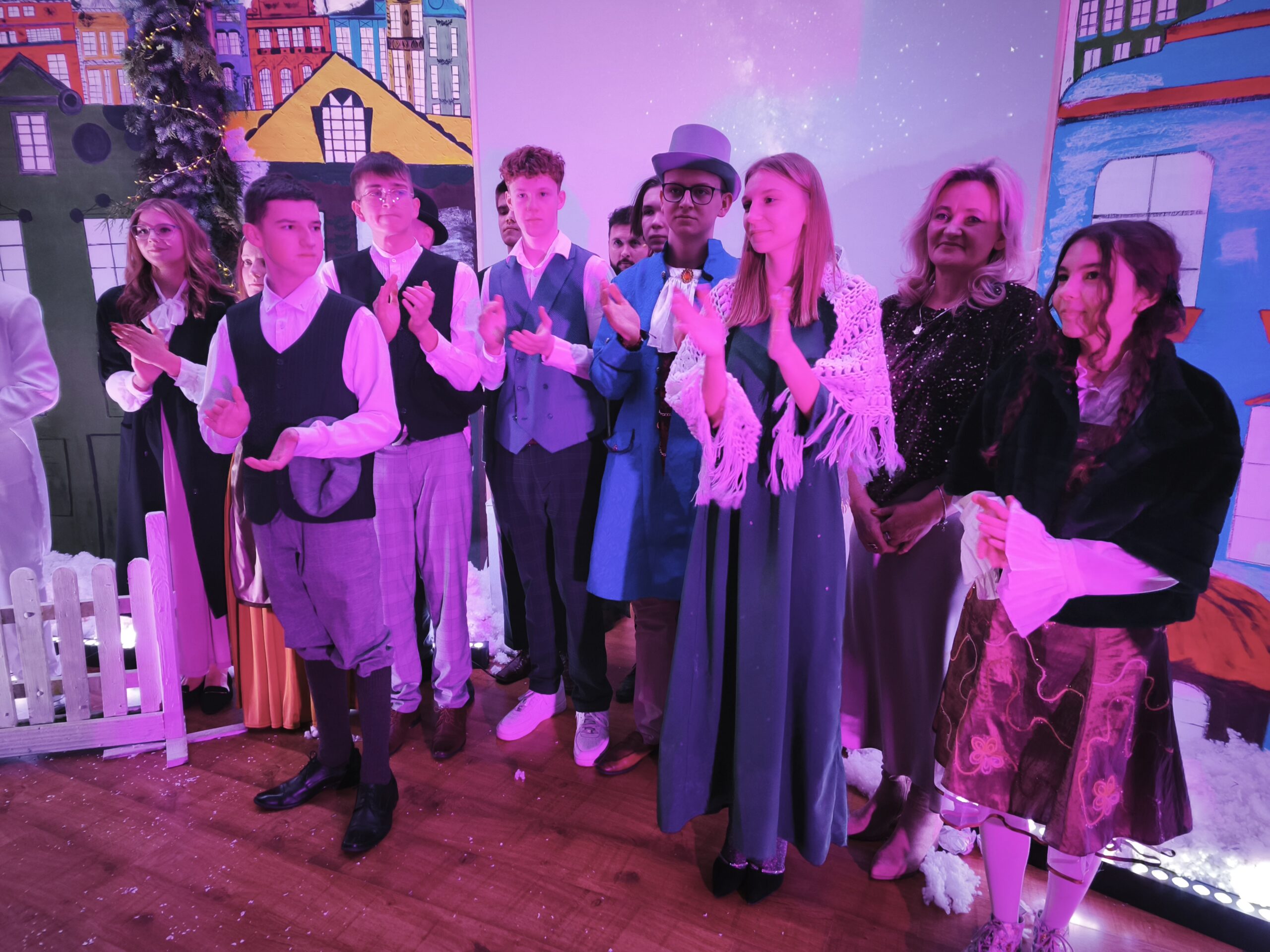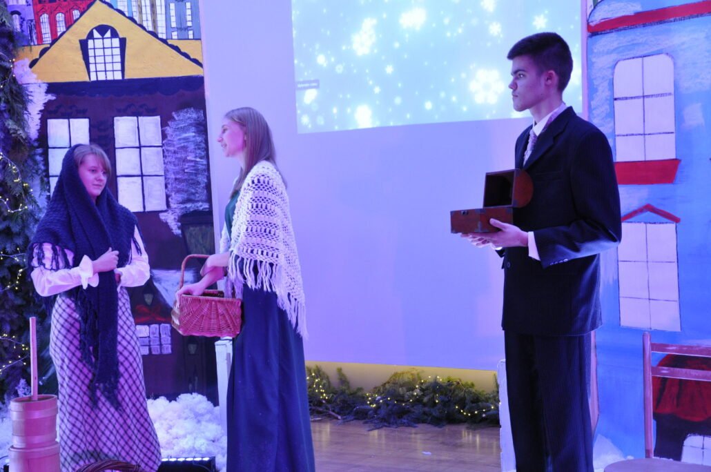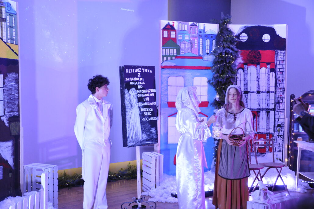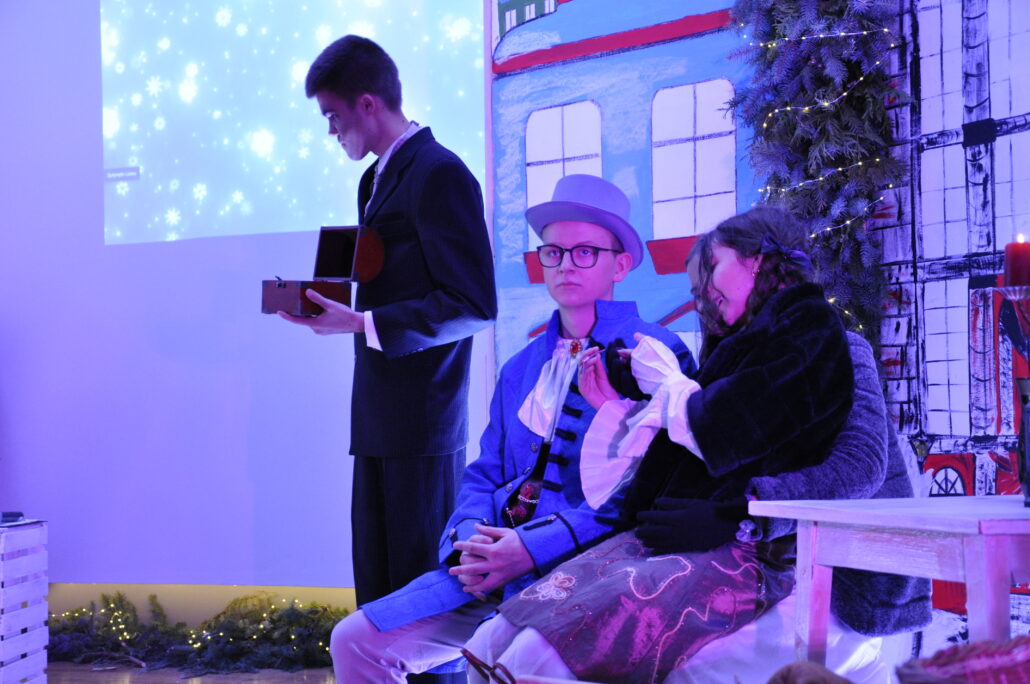 Centralnym punktem spotkania było niezwykle poruszające przedstawienie pt. „Dziewczynka z zapałkami”, przygotowane przez wychowanków oraz wychowawców internatu. Spektakl opowiadał historię dziewczynki z biednego domu, której losy poruszyły serca widzów. Przepiękna scenografia, starannie dobrane stroje oraz nastrojowa, wykonywana na żywo muzyka stworzyły wyjątkową atmosferę. Przedstawienie skłaniało do głębokiej refleksji nad losem osób potrzebujących, często niezauważanych w codziennym pośpiechu. Smutne zakończenie sprawiło, że w niejednych oczach pojawiły się łzy wzruszenia. Artyści zostali nagrodzeni owacjami na stojąco – najpiękniejszym wyrazem uznania.