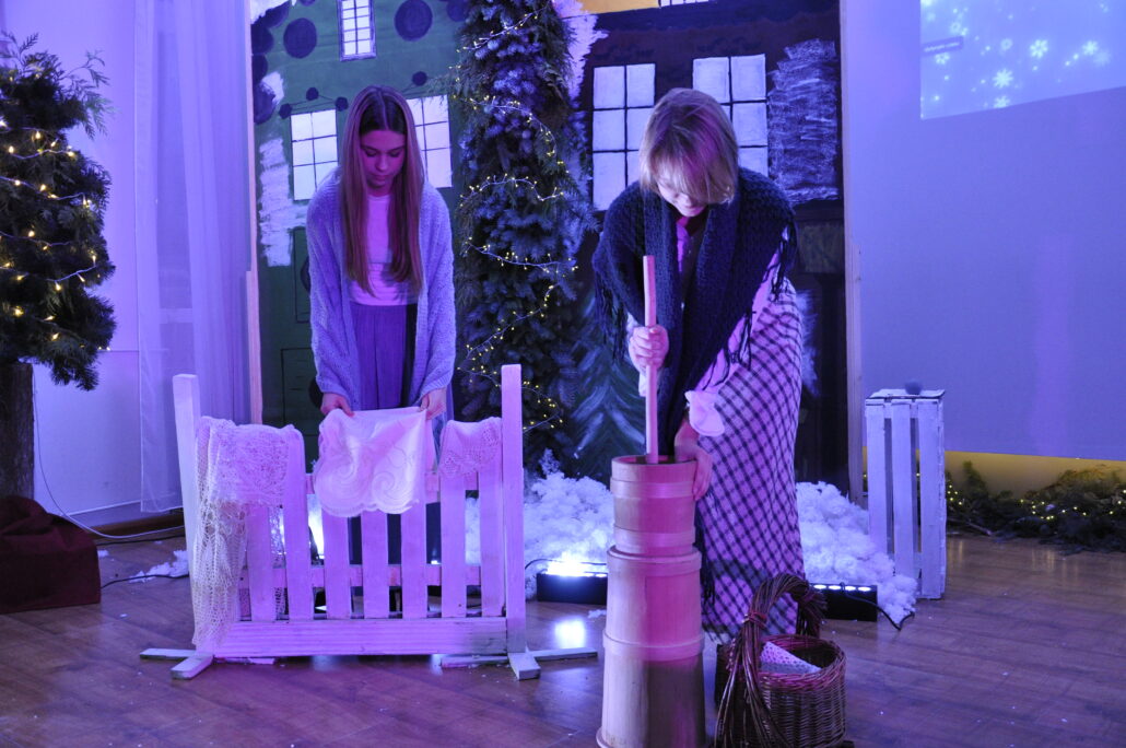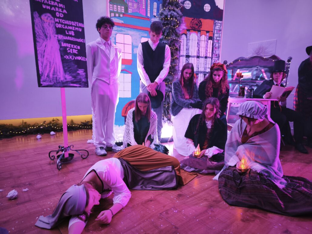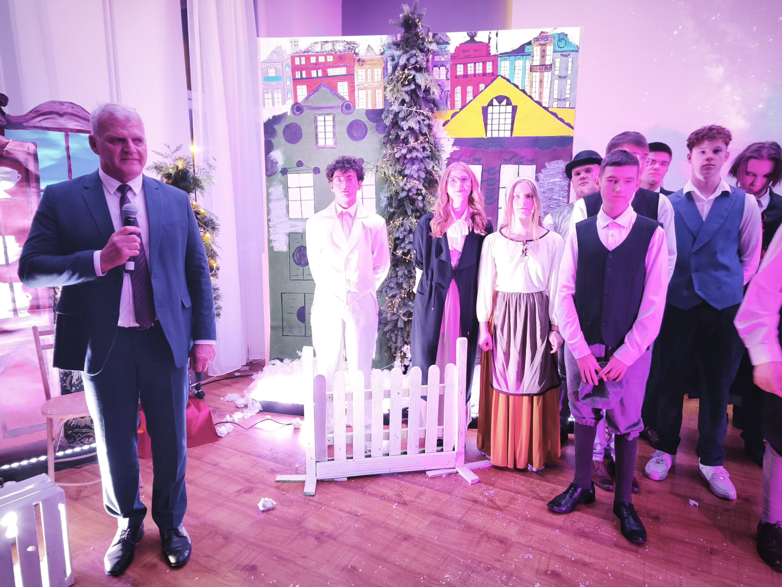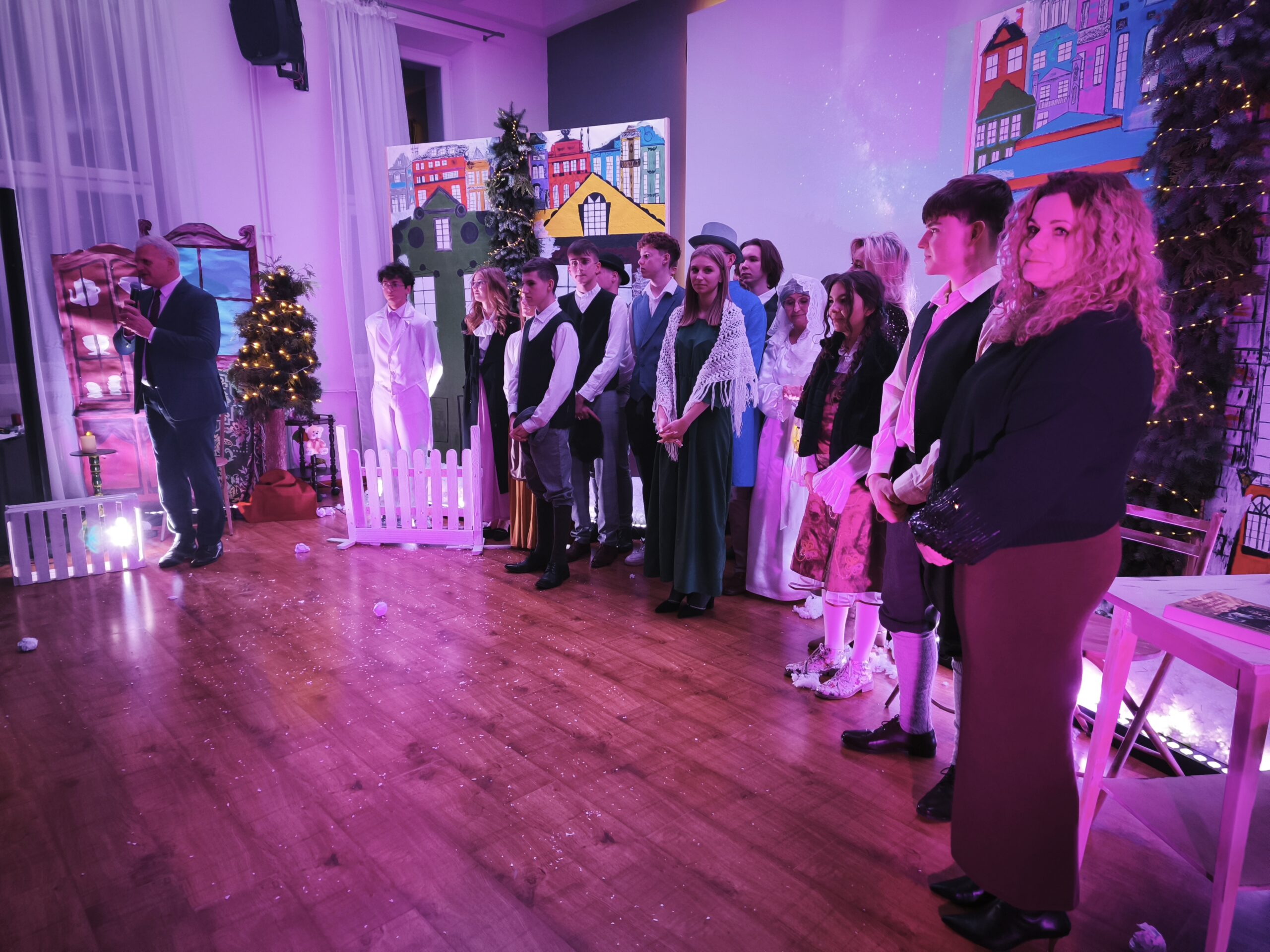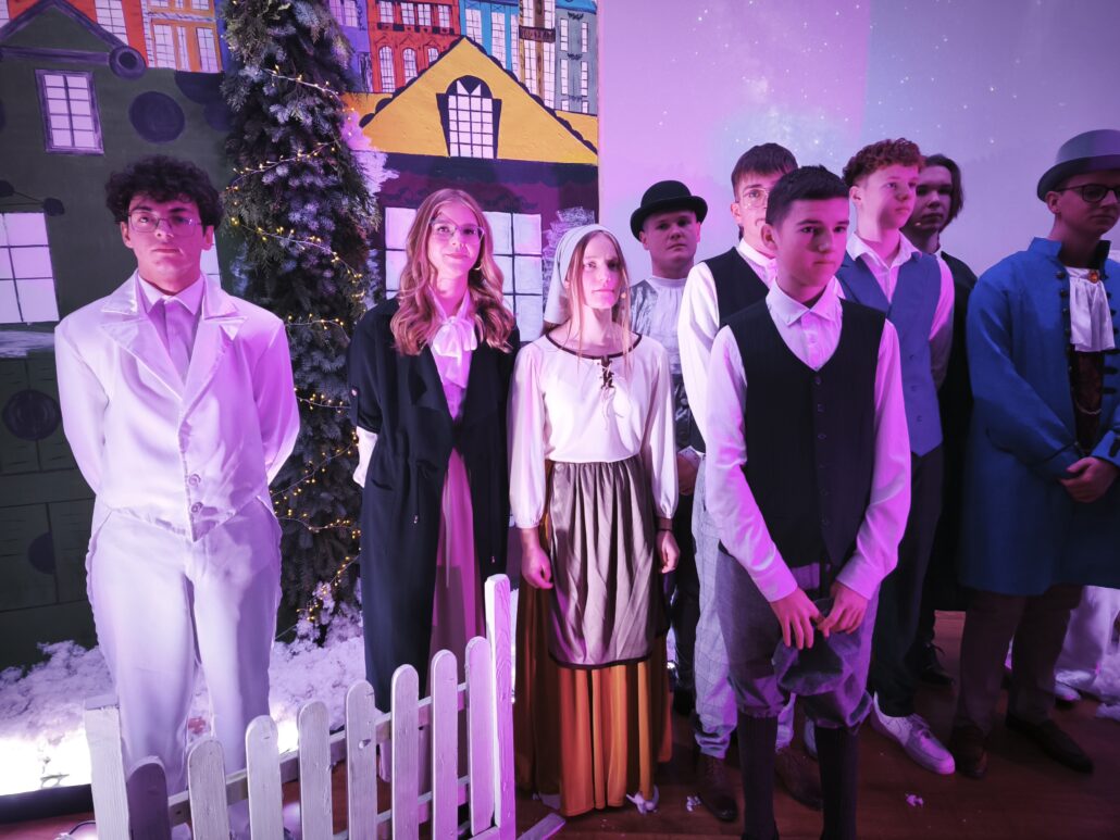 Centralnym punktem spotkania było niezwykle poruszające przedstawienie pt. „Dziewczynka z zapałkami”, przygotowane przez wychowanków oraz wychowawców internatu. Spektakl opowiadał historię dziewczynki z biednego domu, której losy poruszyły serca widzów. Przepiękna scenografia, starannie dobrane stroje oraz nastrojowa, wykonywana na żywo muzyka stworzyły wyjątkową atmosferę. Przedstawienie skłaniało do głębokiej refleksji nad losem osób potrzebujących, często niezauważanych w codziennym pośpiechu. Smutne zakończenie sprawiło, że w niejednych oczach pojawiły się łzy wzruszenia. Artyści zostali nagrodzeni owacjami na stojąco – najpiękniejszym wyrazem uznania.