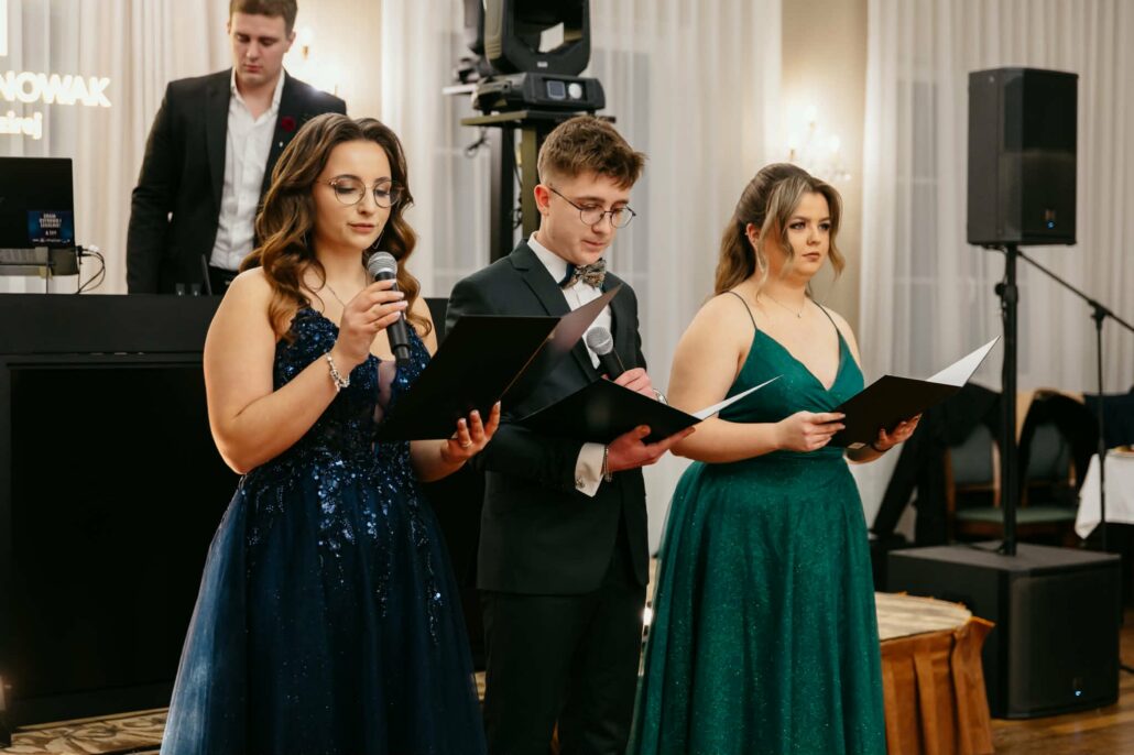 Część oficjalną poprowadzili Weronika Brzozowska, Wiktoria Świnoga oraz Miłosz Kucharski, którzy na początku serdecznie powitali dyrekcję szkoły, grono pedagogiczne, zaproszonych gości, rodziców oraz głównych bohaterów wieczoru, maturzystów.
