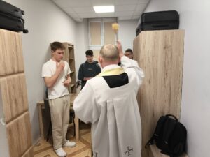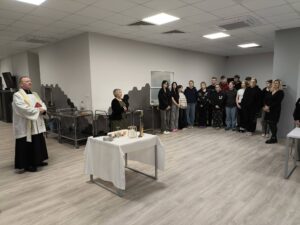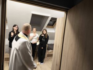 Następnie ks. Łukasz odwiedził pokoje mieszkalne, gdzie indywidualnie poświęcił pomieszczenia oraz ich mieszkańców, poświęcając każdemu chwilę uwagi. Na zakończenie spotkania zasiedliśmy wspólnie do uroczystej kolacji, która była pięknym dopełnieniem tego dnia.