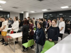 Spotkanie rozpoczęło się w stołówce internackiej, gdzie zgromadziła się młodzież wraz z wychowawcami. Ksiądz proboszcz poświęcił i pobłogosławił zarówno mieszkańców internatu, jak i sam internat – miejsce codziennej nauki, pracy nad sobą oraz odpoczynku. Skierował do nas ciepłe słowa, życząc wszystkim obfitości łask Bożych w nadchodzącym roku. Był to czas wspólnej modlitwy, chwili skupienia i refleksji, ale także radości – razem śpiewaliśmy kolędy, tworząc atmosferę jedności i pokoju, tak bardzo wpisującą się w ducha tego wyjątkowego czasu.
