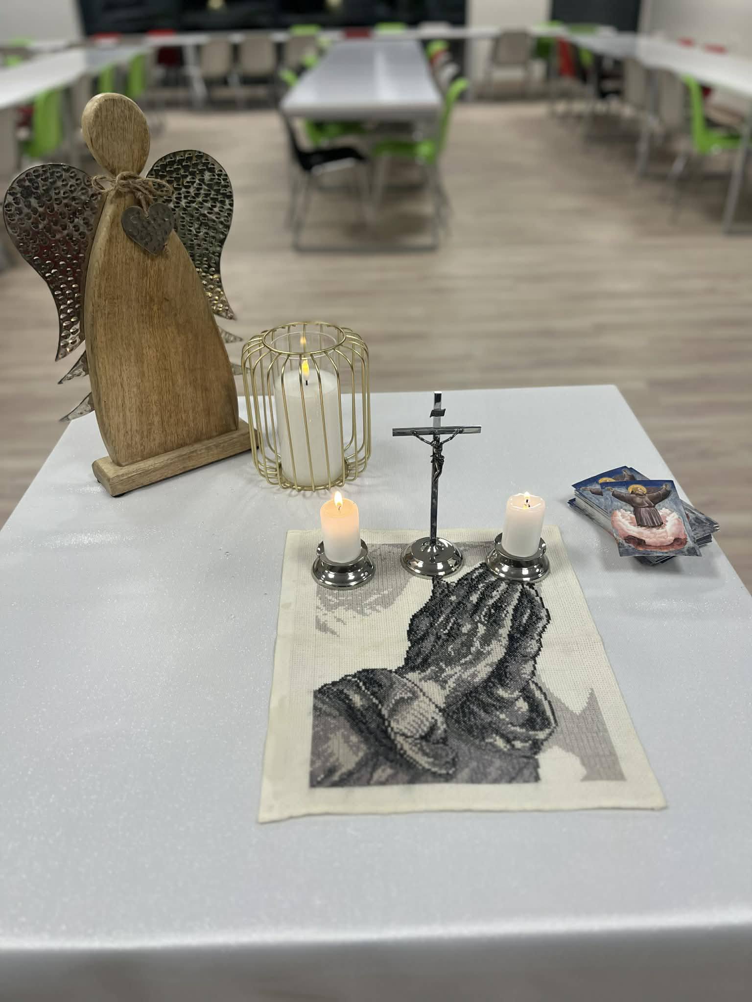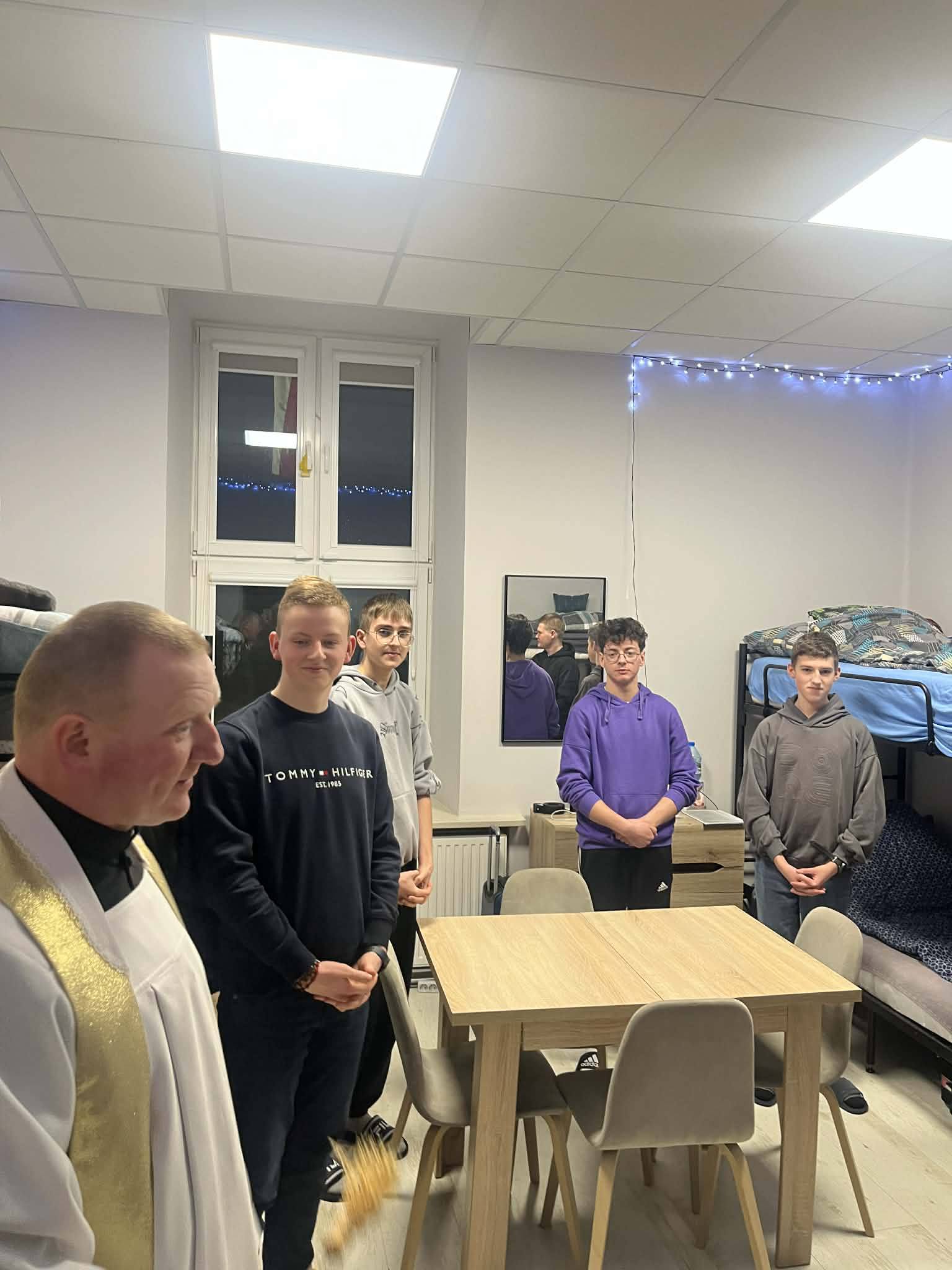 Następnie ks. Łukasz odwiedził pokoje mieszkalne, gdzie indywidualnie poświęcił pomieszczenia oraz ich mieszkańców, poświęcając każdemu chwilę uwagi. Na zakończenie spotkania zasiedliśmy wspólnie do uroczystej kolacji, która była pięknym dopełnieniem tego dnia.