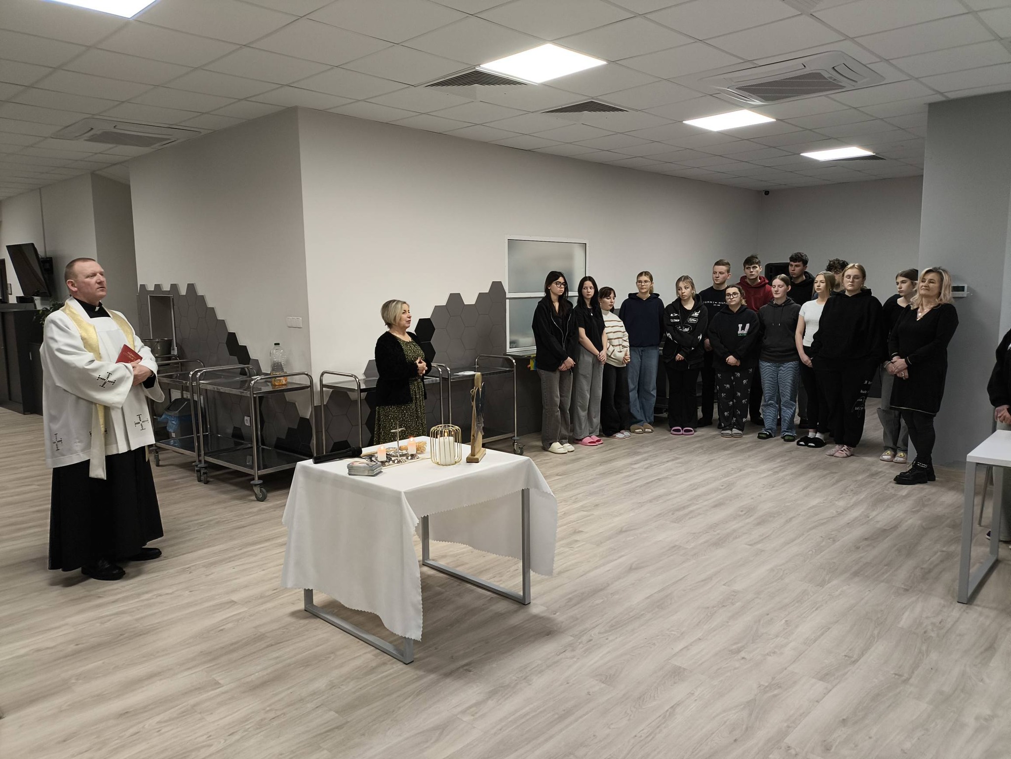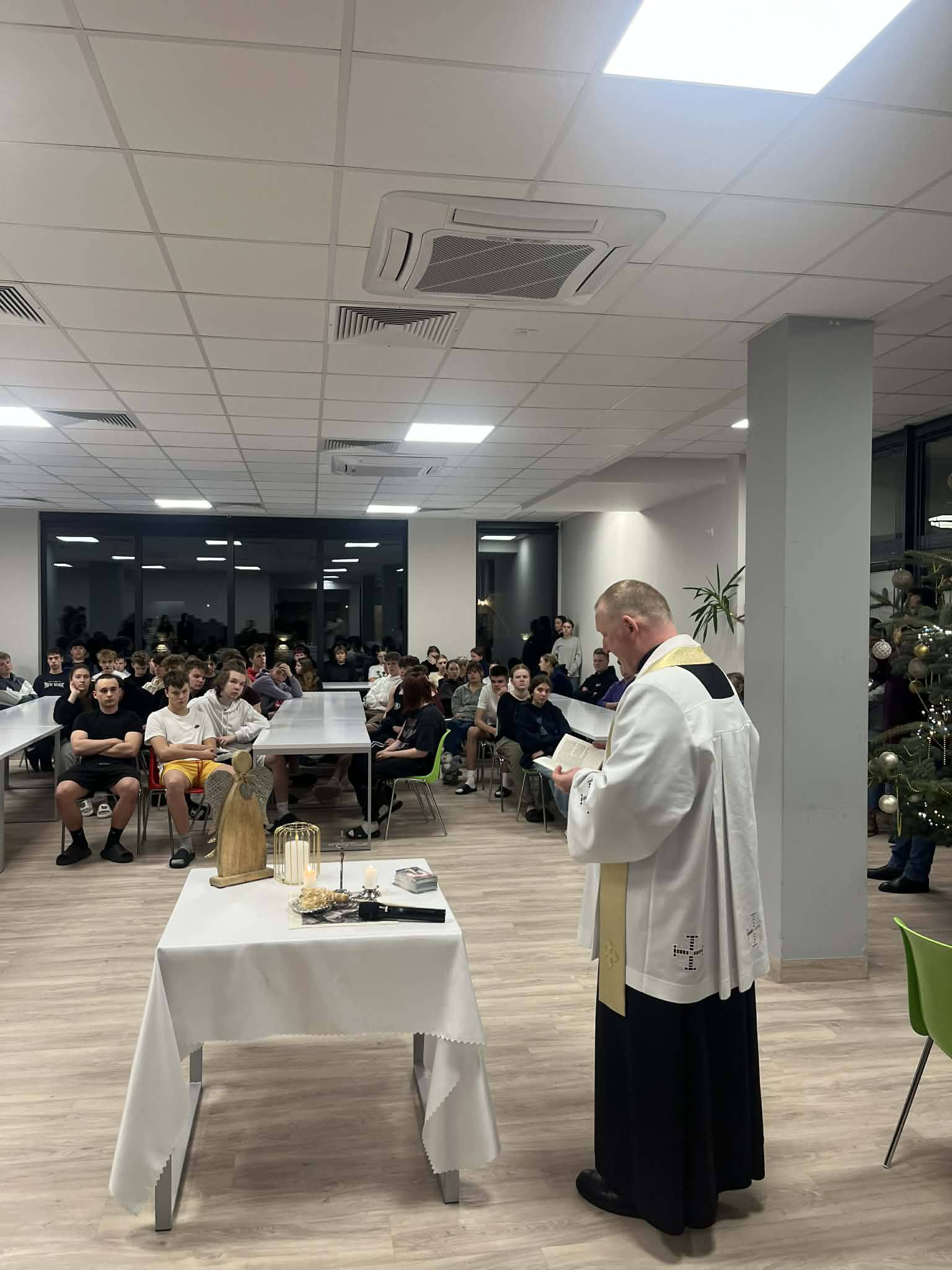 Spotkanie rozpoczęło się w stołówce internackiej, gdzie zgromadziła się młodzież wraz z wychowawcami. Ksiądz proboszcz poświęcił i pobłogosławił zarówno mieszkańców internatu, jak i sam internat – miejsce codziennej nauki, pracy nad sobą oraz odpoczynku. Skierował do nas ciepłe słowa, życząc wszystkim obfitości łask Bożych w nadchodzącym roku. Był to czas wspólnej modlitwy, chwili skupienia i refleksji, ale także radości – razem śpiewaliśmy kolędy, tworząc atmosferę jedności i pokoju, tak bardzo wpisującą się w ducha tego wyjątkowego czasu.